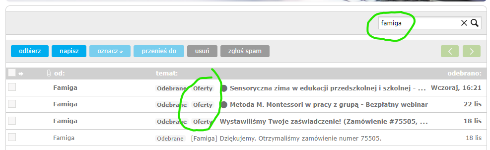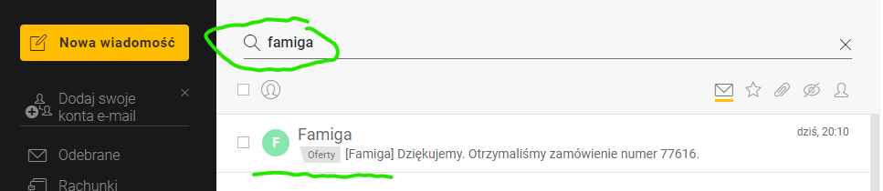 Wpisz w wyszukiwarce na górze po prawej stronie słowo „famiga” i naciśnij enter. Wtedy w wynikach zobaczysz wszystkie emaile ze wszystkich folderów zawierające to słowo. Zobacz, że na poniższym przykładzie kilka emaili trafiło do folderu „Oferty” :(