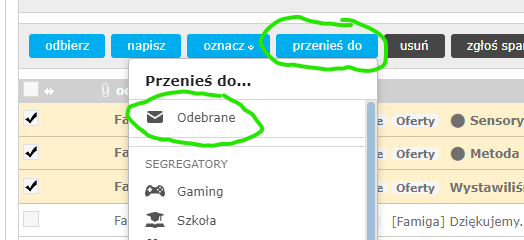 Można to zrobić zaznaczając wybrane emaile, a następnie w menu „przenieść do” wybrać „Odebrane”. Jak na poniższym obrazku.