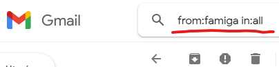 Wpisz w wyszukiwarce na górze strony from:famiga in:all i naciśnij enter. Wtedy w wynikach zobaczysz wszystkie emaile ze wszystkich folderów zawierające to słowo.